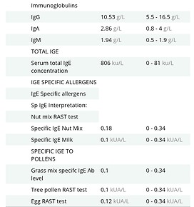 Thank you so much for your reply indid console my doctor te unsure too as all my allergy results came back negative. They thought it may be cold uticaria also how ever I was refused to an allergy clinic and the appointment for a telephone call is not available until July. As I was iching so badly I decided to do an online intolerance test ot came back showing an intolerance to Borth tree pollen and bark. I then realised the times I have gotten the hives I've been sitting in the garden or going for a walk on my road. I had a picture of my self in my relatives garden with my arms on the table I asked about the table and it's indeed made from birch wood also when walking on my road I realised there are birch trees planted everywhere hence why I got them when walking the dog the only baffling thing is that my tree pollen blood test eas negative. The elevated leves were the serium total IGE concentrate 806ku/l shown below